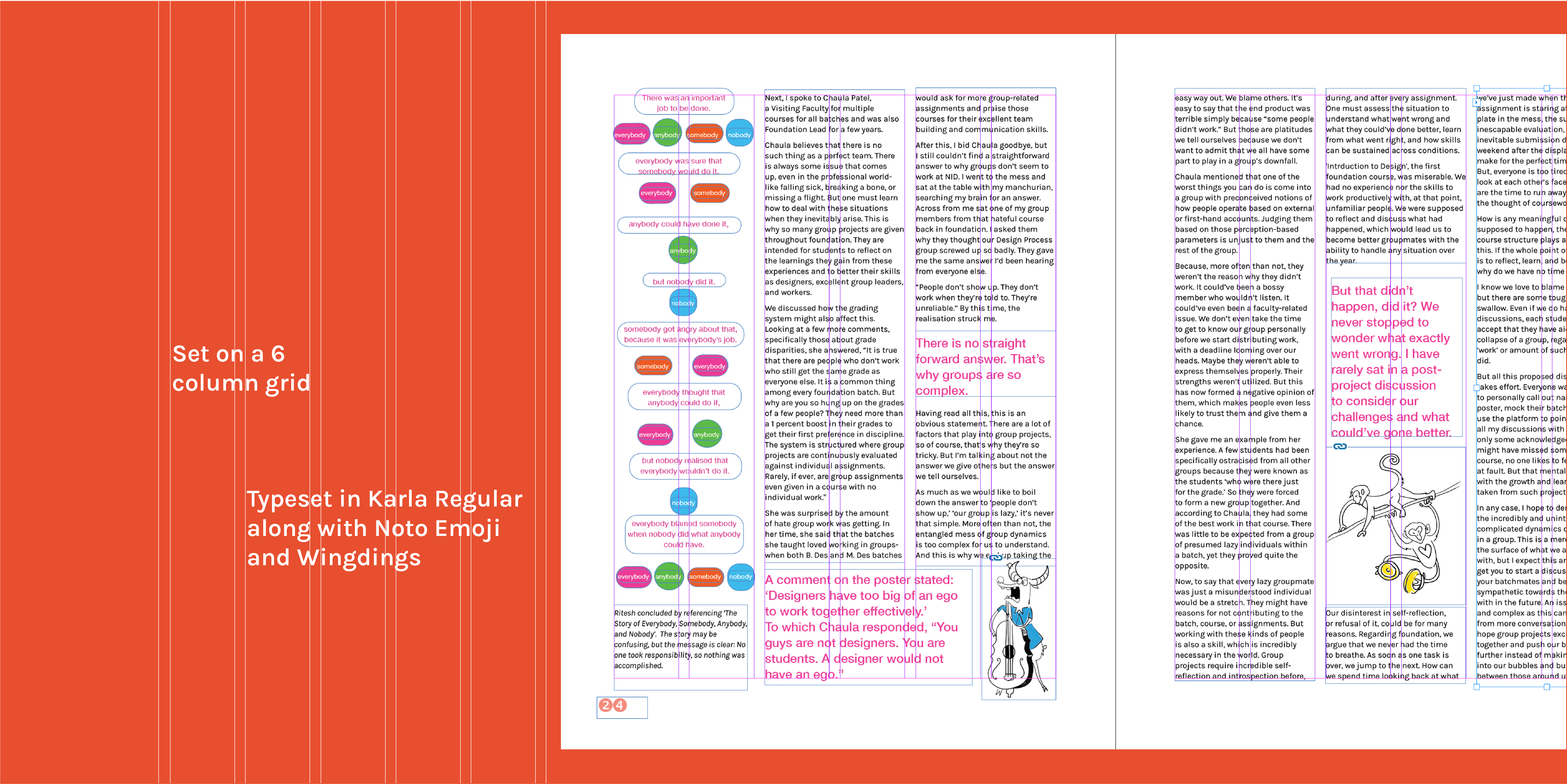 Purandar Dutta for his vision of bringing NID magazine back, Tanishka Kachru and Praveen Nahar for their unending support, Bonita Vaz-Shimray for guiding Riya and I in the first draft of the magazine, Sharan Adka for his views, Ranjan De and Mandakini Menon for showing us the history of NID editorials, Tarun Deep Girdher and Yogesh Patil for print guidance and most importantly, Rajesh Dahiya who said, “Don’t be design nuns.”